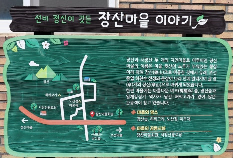 고성 장산숲이 있는 장산(章山)마을은 노루가 누워있는 형상이라 하여 장산(獐山)에서