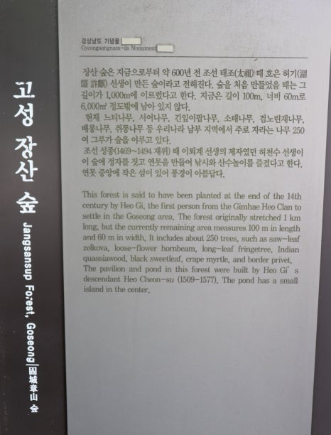 고성 장산숲은 조선 성종 때 퇴계 선생의 제자였던 허천수 선생이 정자를 짓고 연못을