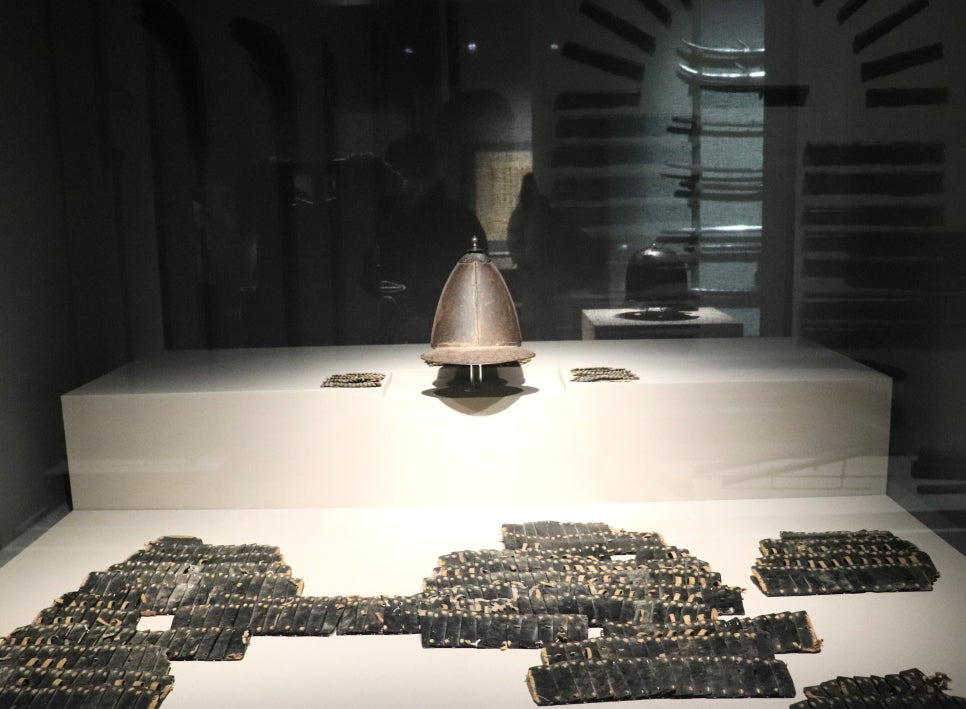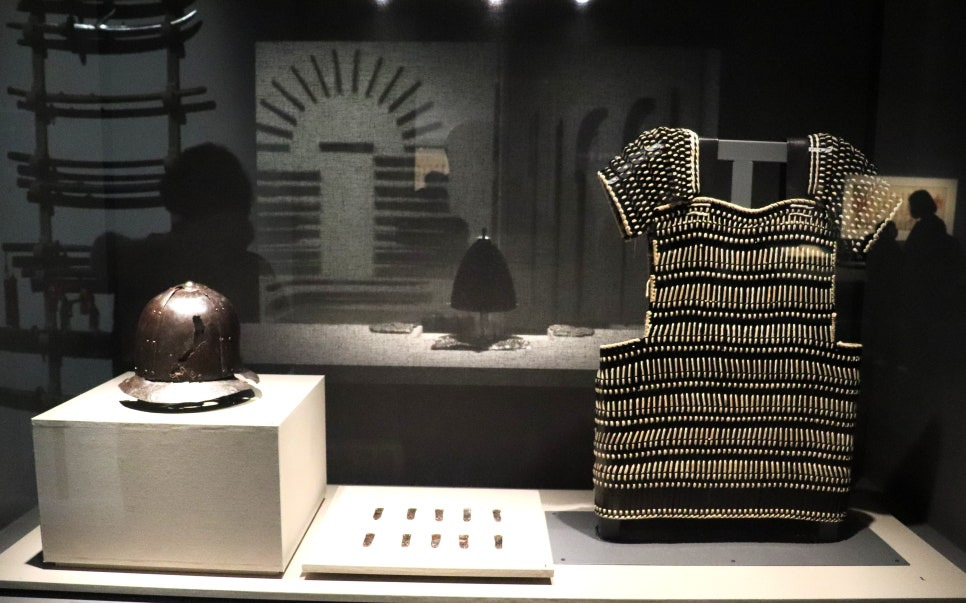 차양이 있는 투구(첨주/簷胄)를 비롯한 찰갑편과 복원한 철갑